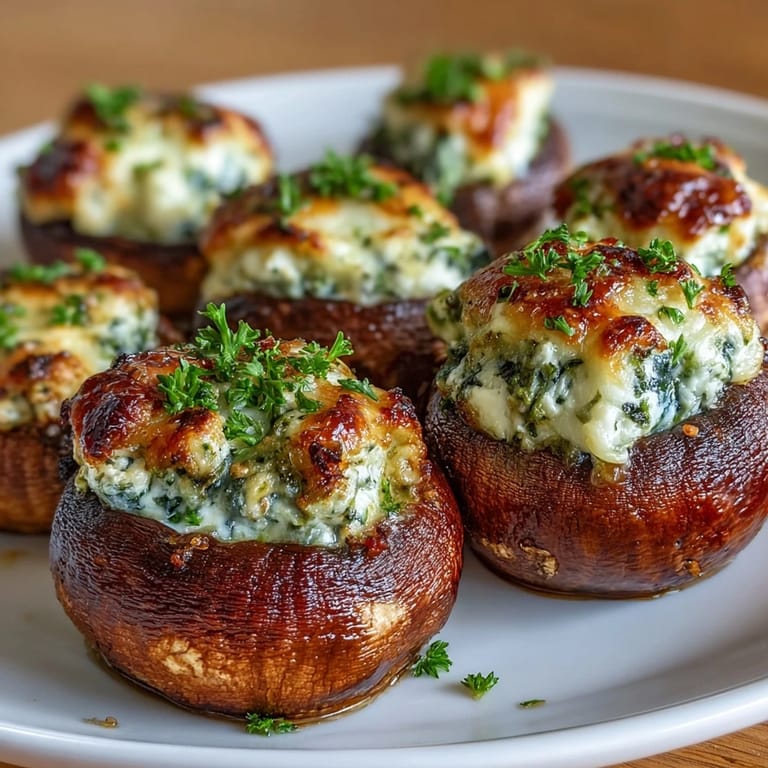 Serve these stuffed mushrooms warm, garnished with a sprinkle of fresh parsley. For a refined pairing, enjoy them with a chilled glass of Sauvignon Blanc or a light Pinot Grigio.