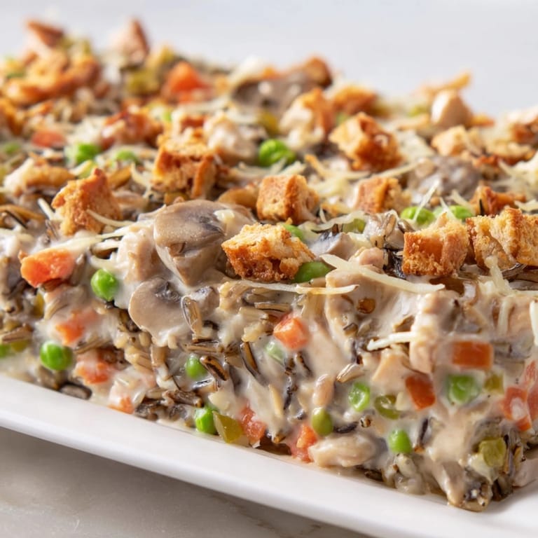 Save to Pinterest A comforting casserole featuring tender chicken, nutty wild rice, and a creamy sauce, baked to golden perfection. Perfect for a cozy family dinner.