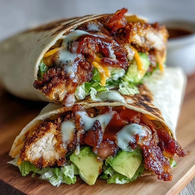 Save to Pinterest Crunchy bacon and golden-seared chicken meet creamy avocado, tangy mayo sauce, and fresh lettuce in a softly toasted tortilla for a satisfyingly bold handheld meal. This dish is perfect for a filling lunch that brings together savory spices and crisp textures.