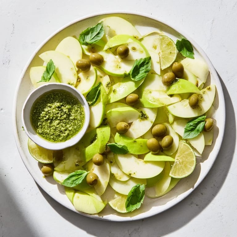 A snack board bridges that awkward moment between arrival and dinner service. It's casual enough to pick at while chatting, but thoughtful enough that guests feel welcomed. The mix of textures—crisp apples, buttery olives, creamy pesto—keeps things interesting without heaviness.