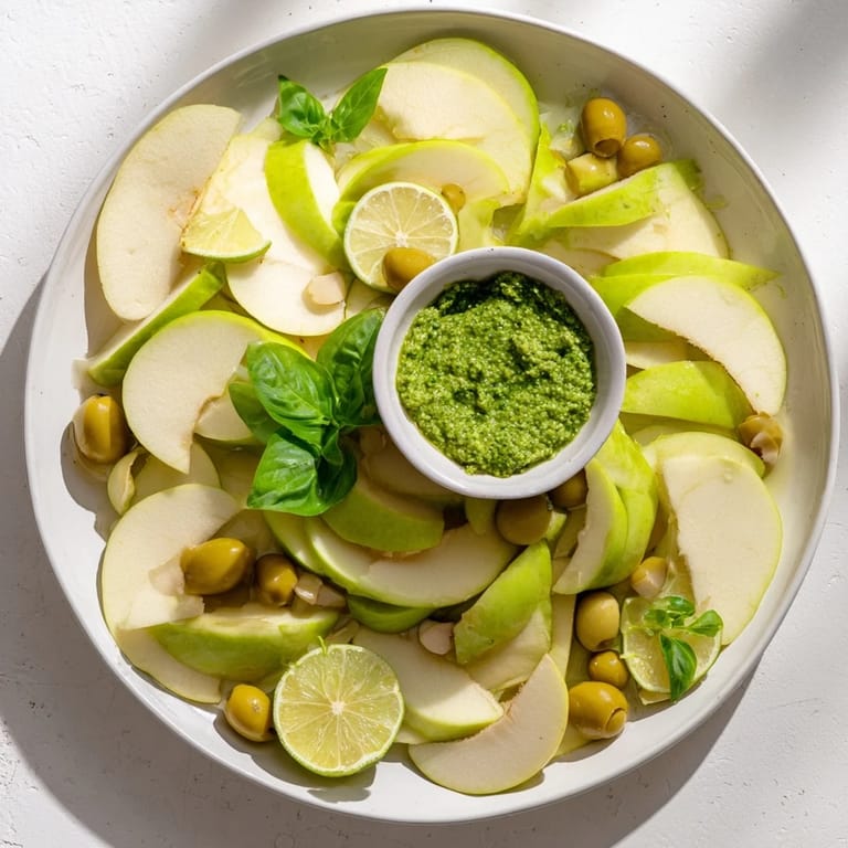 Alternate apple slices with lime rounds, place pesto in a small bowl, and scatter olives to fill gaps for a balanced look.