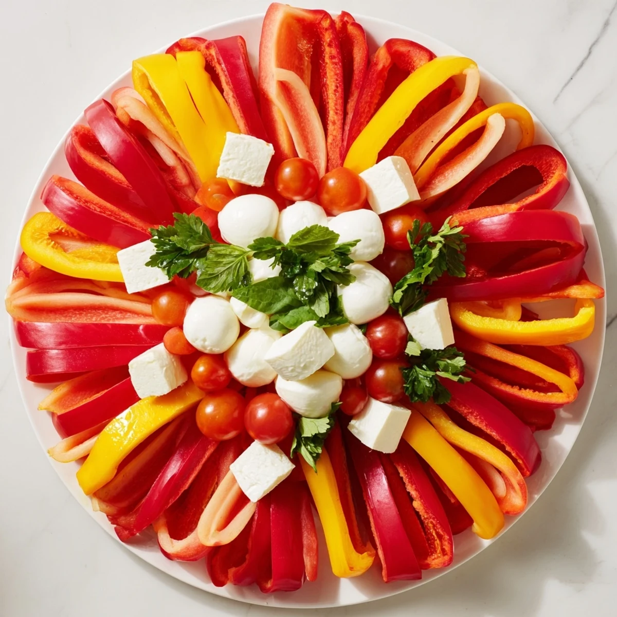 Slice red bell peppers into long strips to form petals, then use yellow bell pepper rings and cherry tomatoes to contrast and highlight the flower shape on a round platter.