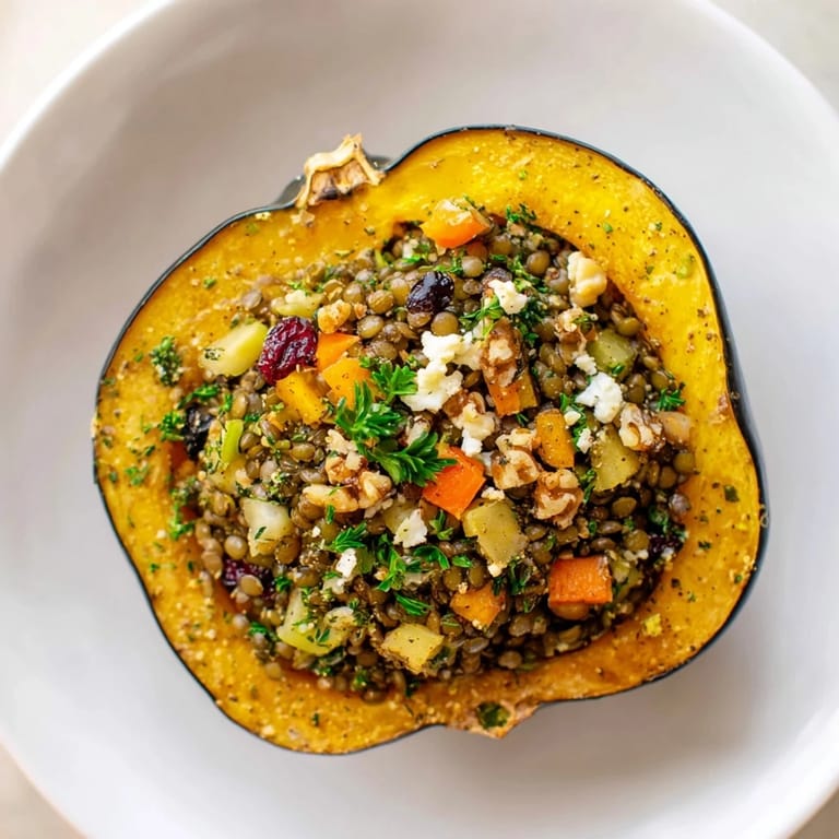 Save to Pinterest A hearty, flavorful dish featuring acorn squash halves filled with a savory mixture of lentils, walnuts, vegetables, and herbs. Perfect as a vegetarian main or festive side.
