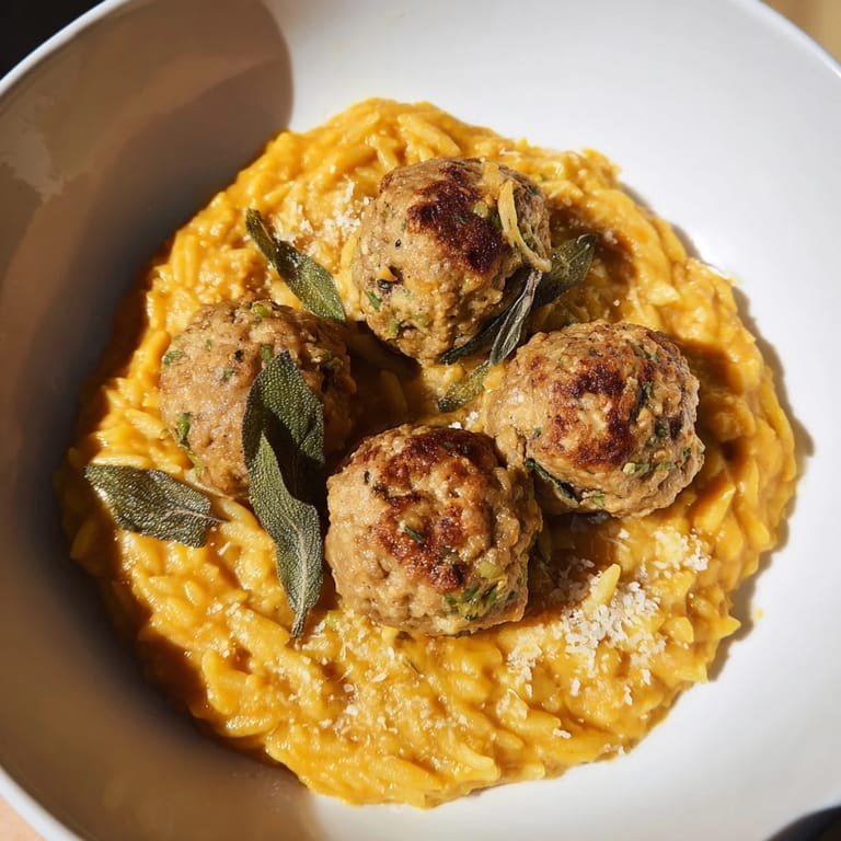 Save to Pinterest Savory sage turkey meatballs simmered with creamy pumpkin orzo for the ultimate cozy fall dinner.