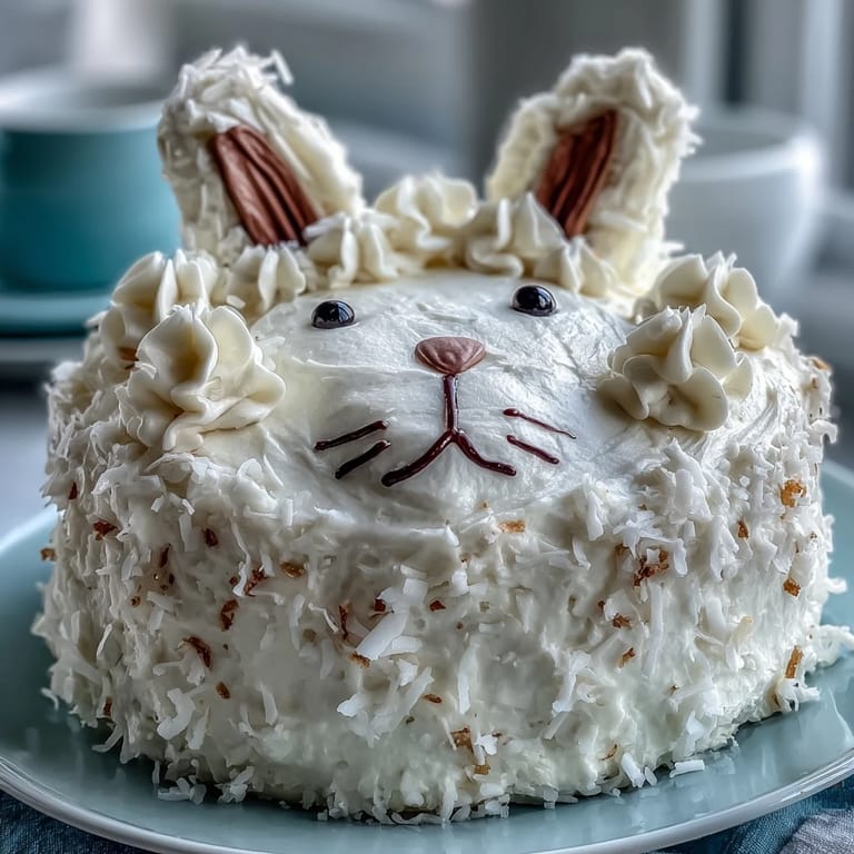 Ensure all your ingredients—especially butter, eggs, and milk—are at room temperature before you begin. This helps create a smooth, evenly mixed batter and prevents the butter from seizing when combined with cold liquids. When assembling the bunny shape, use a serrated knife for clean cuts and take your time positioning the ears and bowtie before you start frosting. The crumb coat is essential: this thin first layer of buttercream seals in any loose crumbs, making your final frosting layer beautifully smooth. Chill the crumb-coated cake for at least 20 minutes to set the frosting before applying the final layer. When pressing coconut onto the cake, work in small sections and use gentle pressure to ensure it adheres well without disturbing the buttercream underneath.