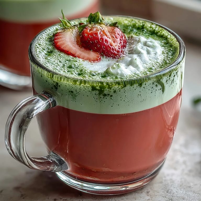 Save to Pinterest The magic of this latte lies in its layers. First comes the strawberry purée — softened on the stovetop with just a touch of sugar and water until it becomes silky and syrupy, fragrant with the natural perfume of the fruit. Then the milk, steamed and frothed to a gentle foam, pours over it in a warm cascade. Finally, the whisked matcha settles on top in a rich, jade-green layer, its grassy depth playing beautifully against the berry sweetness beneath. Each sip stirs them gently together, and the result is something far greater than the sum of its parts.